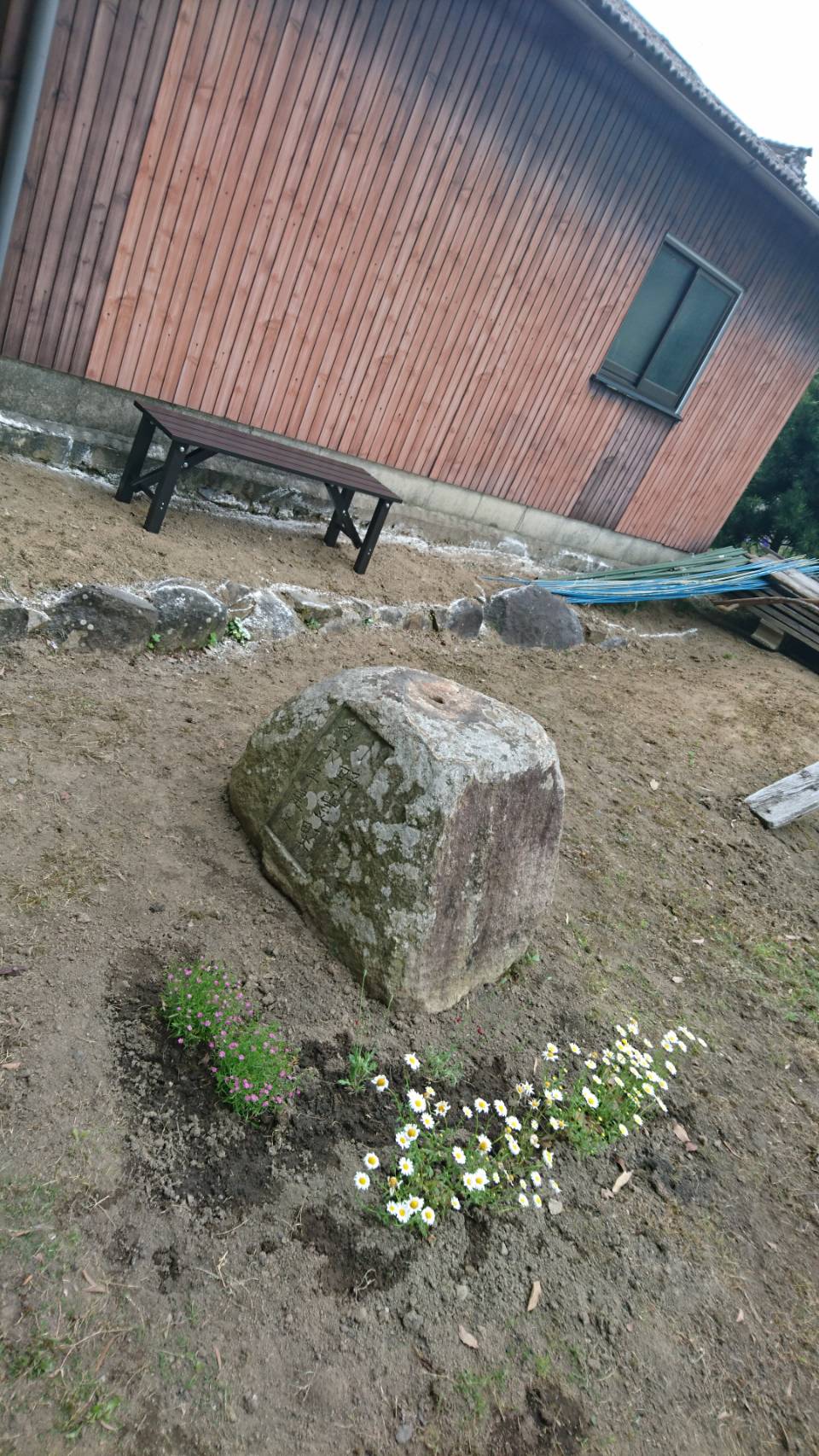 2020/05/6 どうせやるなら楽しく遊び心を持って! それならまずは名前を付けないとね。ということで、この畑は「豊野(とよの)ガーデン」とネーミングしました。実は写真の手前にあるのは一昨年前の山崩れで転がり落ちたご先祖「豊野さん」の米寿記念の石碑なんです。この石碑をモニュメントにして畑を整備しようと考えました。畑というより、ガーデンの方がいいかな、と。さっそくアマゾンでベンチを買って置いてみました。石碑の周りに小花も植えて、ちょっといい雰囲気に。
